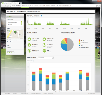 And since these are miCoach compatible, I went ahead and bought an adidas miCoach Speed Cell. This is a little chip that fits in a slot under the insole of the left boot, and tracks your movement. I played my first game with these shoes (and chip) tonight, and the results are in - see screenshot below, or go to this link.